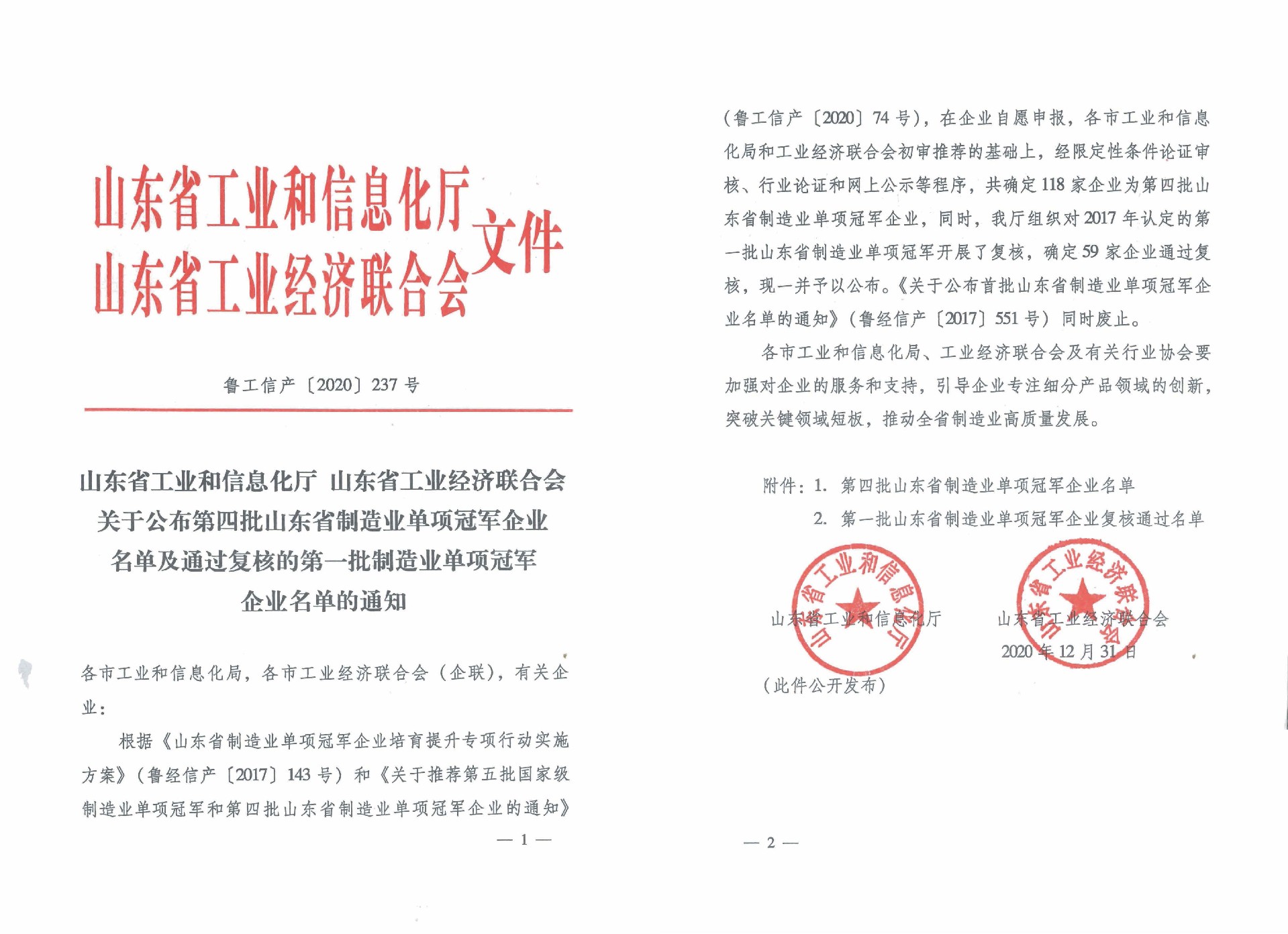 制造業單項冠軍企業是指長期專注于制造業某些特定細分產品市場,生產技術或工藝國際領先,單項產品市場占有率位居全球前列的企業。此項榮譽是山東省對我司產品研發實力和對核心產品技術開拓進取、攻堅克難的實力認可,同時也是對我司上下一致、刻苦鉆研、積極創新精神的肯定。